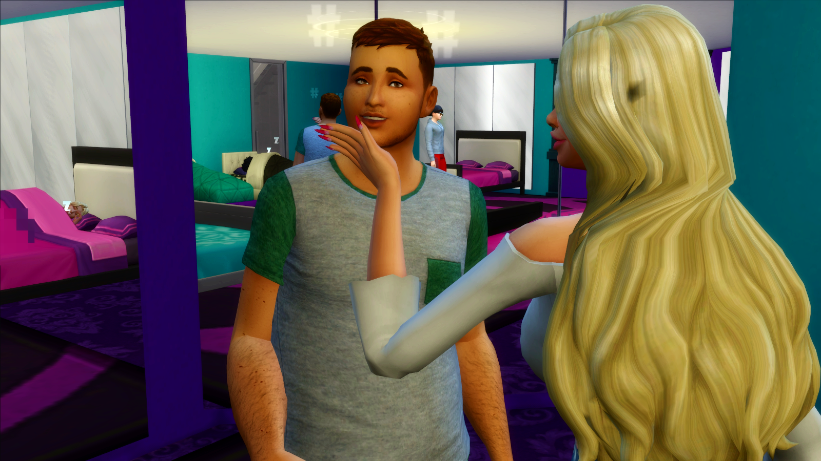 Some of the sims are exhausted from the day full of press interviews and look to take an early night. It looks like we have a winner for the Lucky Bed Power!!! Colette is the first to sleep in the Lucky Bed, meaning she will receive a power on Week 3 that could change her game or someone else's for better or for worse.