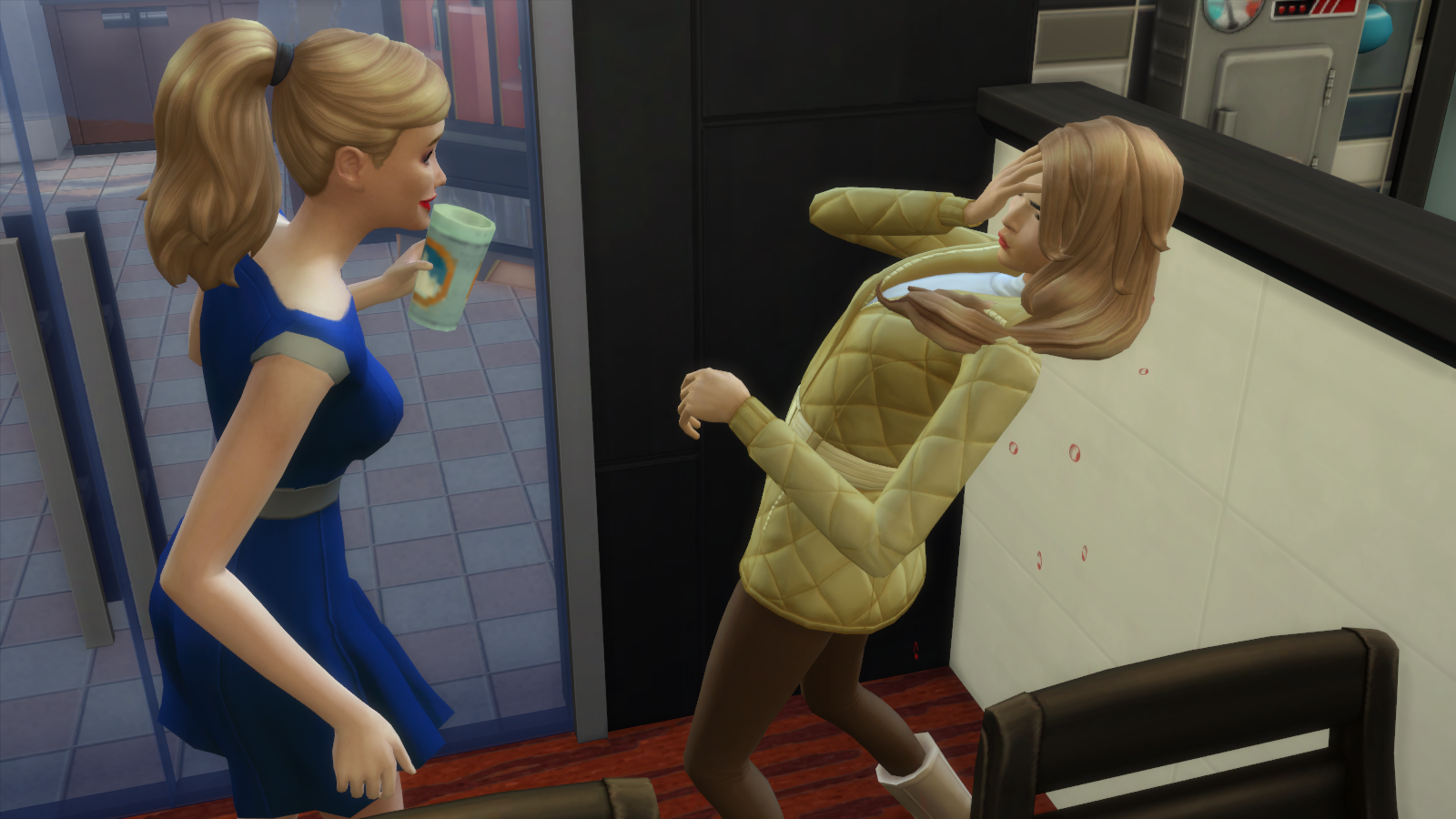 Maddison looks to break the ice. No one had grabbed a drink yet and she was going to be the first one to do it. She wants to get this party started and urges the other sims to loosen up and grab some drinks. No Change in friendship, she's starting off by grabbing a drink to loosen up.